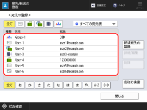 画面上部と下部の、インデックスや[名称で検索]を選択すると、一覧に表示される宛先を絞り込んで表示できます。アドレス帳の画面