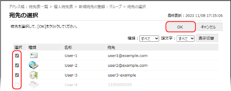 グループに登録する宛先にチェックマークを付け、[OK]をクリックする