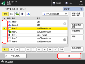 スキャンの画面の場合は、指定する宛先のボタンを選択し、[OK]を押します。