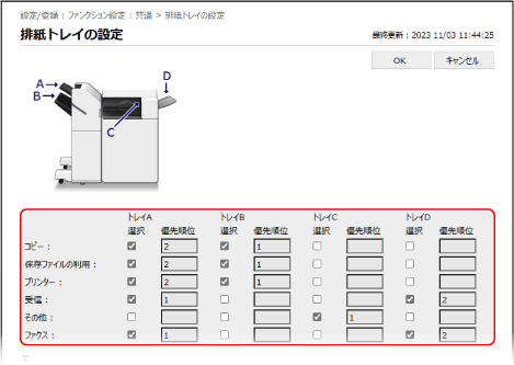 1 つの機能に複数の排紙トレイを指定して、優先順位を指定することもできます。その場合、上位に指定した排紙トレイの容量がいっぱいになると、排紙先は下位に指定したトレイに自動的に切り替わります。