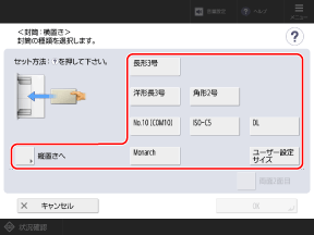 封筒の向きに応じて[縦置きへ]または[横置きへ]を押し、封筒のサイズを選択します。