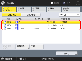 3で、ジョブを選択して[割込/優先プリント]を押すと、選択したジョブを実行中や待機中のジョブに割り込ませることができます。