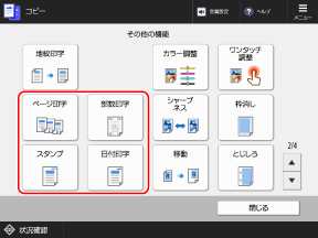 ページ番号や日付などの情報を付けてコピーします。「社外秘」などのスタンプを付けることもできます。スタンプには、任意の文字列を指定することもできます。