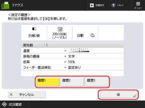 [設定の履歴]画面で、呼び出したい履歴を選択し、[OK]を押します。