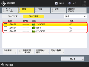 ※履歴を表示しないように設定されている場合は、送信/受信状況のみ確認できます。[ジョブ履歴の表示]