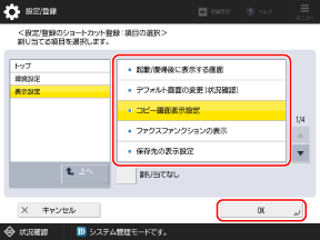 ショートカットとして登録する設定項目を選択し、[OK]を押す