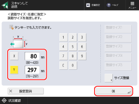 [長さで指定]を押します。[XY同率]または[XY独立]を選択し、原稿サイズと記録サイズ(スキャンデータの用紙サイズ)を 1 mm単位で指定して、[OK]を押します。