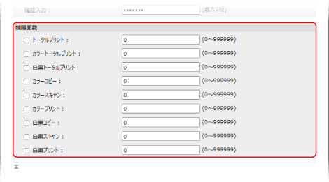 プリント/スキャン/コピーできるページ数を制限する場合は、対象の項目にチェックマークを付け、上限となるページ数を入力します。