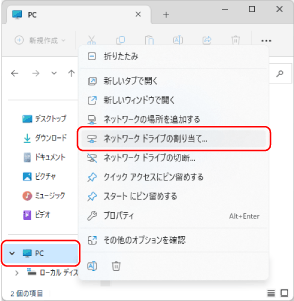 [PC]を右クリックし、[ネットワークドライブの割り当て]をクリックする