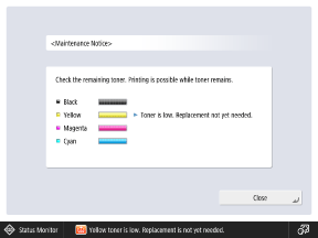 Until you delete the notification screen, it appears each time the machine exits Sleep Mode or the main power is turned ON. To delete the notification screen, perform the [Delete Remaining Toner Error] operation. [Delete Remaining Toner Error]