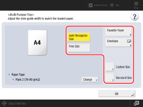 When paper is loaded in the multi-purpose tray, the following screen is displayed on the control panel. Set the paper size and type according to the loaded paper.