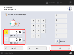 If you do not know the size (length of side) of the loaded paper, or you want to print using the paper size set in the printer driver, press [Free Size]. In this case, you do not need to perform Step 2 (entering the length of side).
