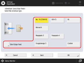 Press [Long Edge Feed] or [Short Edge Feed] according to the orientation of the envelopes, and select the envelope size.