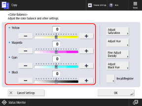 If you often use originals with a specific color tone, you can register the adjusted color settings. You can then recall the settings on the screen for adjusting the color balance, saving you the trouble of adjusting the color balance each time.