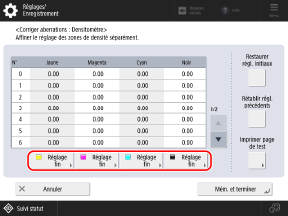 Numérisez la page de test imprimée avec la machine, faites déterminer et corrigez les valeurs de densité.