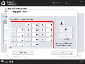 Utilisez le panneau de commande pour effectuer la correction. Vous ne pouvez pas effectuer de réglage à l’aide de l’interface utilisateur distante depuis un ordinateur.