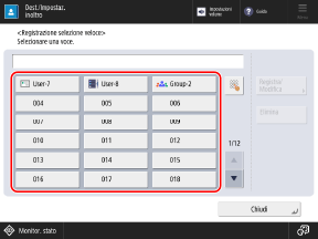 Schermata [Home]Nella schermata di scansione (Scansione e invio) o fax, è possibile premere [Rubrica] per modificare o eliminare una destinazione dalla schermata della rubrica.