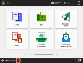 Home] sul pannello di controllo. Per impostazione predefinita, la schermata [Home] viene visualizzata dopo l’accensione della macchina, subito dopo la chiusura della schermata di avvio e se non vengono svolte operazioni per un determinato periodo di tempo su ciascuna schermata.