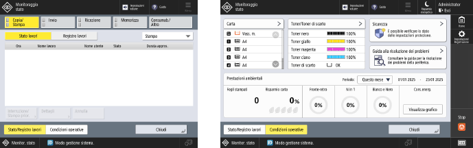 È possibile selezionare [Stato/Registro lavori] per verificare lo stato operativo e la cronologia di ciascuna funzione e la quantità rimanente di consumabili e parti.