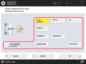 Premere [Alimentazione lato lungo] o [Alimentazione lato corto] in base all'orientamento delle buste e selezionare il formato della busta.
