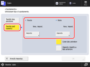 * Se si imposta [Originali formati misti] e si seleziona [Autom.] in [Selezione carta], l'impostazione [Spostamento] risulta disabilitata anche se è configurata.