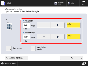Se questa opzione è impostata su [Autom.], l'originale copiato viene ripetuto automaticamente per il numero massimo di volte consentito dalle dimensioni della pagina.