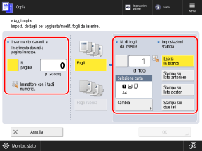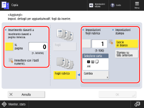 Premere il pulsante [N. pagina] per selezionarlo e specificare il numero di pagina in cui inserire il foglio usando i tasti numerici.
