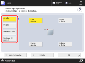 Nella schermata di copia, premere [Opzioni] [Finitura]. Schermata di copia
