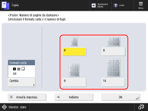 Per realizzare una copia suddivisa, è possibile specificare il rapporto di riproduzione dell'originale o la carta e il numero di fogli da utilizzare.