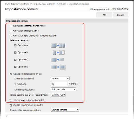 Selezionare la casella di controllo [Abilitazione piè di pagina su pagine ricevute]. Informazioni quali la data e l'ora di ricezione e il numero di pagina vengono stampate in fondo alla pagina.