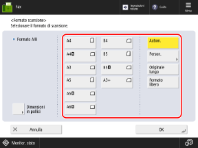 Nella schermata del fax, premere il pulsante di impostazione del formato dell'originale.