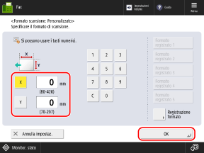 Attenersi alla procedura indicata di seguito per registrare i formati quando si utilizzano spesso degli originali con formati specifici non standard. È possibile richiamare il formato nella relativa schermata di inserimento, così da non doverlo inserire ogni volta.