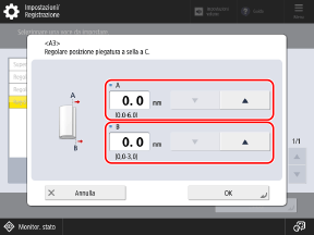 Regolare il valore [A] per spostare il bordo destro della superficie sovrapposta superiore verso destra oppure regolare il valore [B] per spostare la posizione della piegatura destra verso destra.