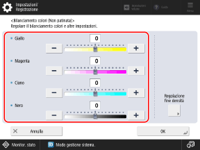 Selezionare il colore per effettuare una regolazione precisa e spostare il dispositivo di scorrimento per ciascuna area di densità verso sinistra o destra per regolare il bilanciamento del colore.