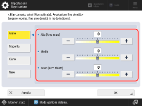 Regola il bilanciamento del colore di giallo, magenta, ciano e nero quando si stampa a colori. È possibile regolare i livelli delle tre aree di densità per ciascun colore.
