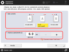 Per [Regolazione posizione piegatura pinzatura a sella], premere [+] per spostare la posizione di piegatura verso destra del lato di stampa o premere [-] per spostare la posizione di piegatura verso sinistra del lato di stampa.