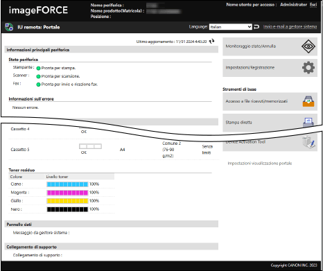 Quando si accede alla IU remota, viene visualizzata la pagina del portale (pagina principale della IU remota). È possibile verificare lo stato operativo della macchina, visualizzare varie informazioni e modificare le impostazioni facendo clic sui pulsanti.