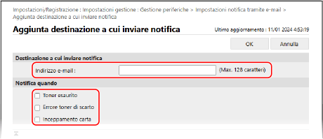 Le destinazioni degli avvisi registrati vengono aggiunte all'elenco delle destinazioni degli avvisi nella schermata [Impostazioni notifica tramite e-mail].