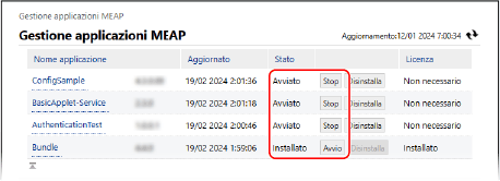 È possibile avviare e interrompere l'utilizzo delle applicazioni MEAP e disinstallarle. È inoltre possibile impostare le informazioni di autenticazione delle applicazioni.