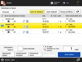Su questa schermata, è possibile stampare i documenti In attesa forzato, di Stampa protetta o di Stampa protetta crittografata. È anche possibile verificare il contenuto o modificare le impostazioni di stampa di tali documenti e dei documenti di Stampa pianificata.