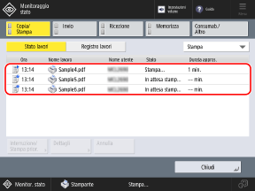 Quando si preme [Stampa prioritaria], il lavoro selezionato viene posto in cima alla lista d'attesa. Il lavoro selezionato viene eseguito al termine del lavoro precedente in corso.