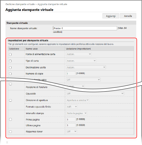 Configurare le impostazioni di stampa in [Impostazioni per stampante virtuale].