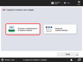 Quando viene visualizzata una schermata di collegamenti con le funzioni disponibili dopo l'inserimento di un dispositivo di memoria USB nella macchina, è possibile premere [Scansione e memorizzazione in supporto memoria] per salvare immediatamente i dati da [Scansione e memorizzazione].