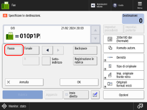 Accedere alla IU remota fare clic su [Impostazioni/Registrazione] [Invio] [Impostazioni TX - Impostazioni fax] in [Impostazione durata pausa], inserire il tempo di pausa fare clic su [OK] |