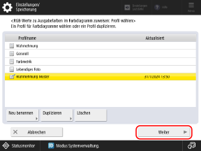 Wählen Sie das erstellte Profil aus, und drücken Sie [Weiter].