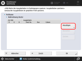 Drucken Sie von einem Computer das "Farbdiagramm für die Zuordnung von RGB-Werten zu Ausgabefarben im Farbdiagramm" auf dem Gerät aus, und beachten Sie die Tabelle, um bestimmte Farben im Profil zu registrieren.