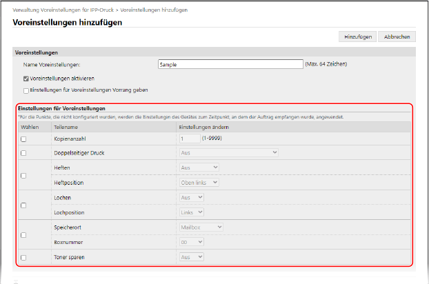 Auf dem Bildschirm [Verwaltung Voreinstellungen für IPP-Druck] können Sie auf den Namen einer Voreinstellung klicken, um die Einstellungen zu bearbeiten.