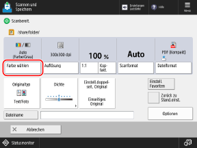* Farbige Originale können je nach Beschaffenheit und das Format des Originals als schwarzweiß erkannt werden, wenn beispielsweise nur die Ränder des Originals in Farbe sind. Wählen Sie in diesem Fall [Vollfarbe].