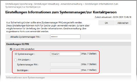 Um die PIN zu ändern, aktivieren Sie das Kontrollkästchen [PIN ändern], und geben Sie die gleiche PIN unter [Systemmanager PIN] und [Bestätigen] ein.