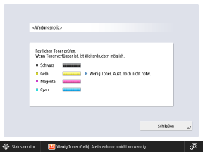 Solange Sie den Benachrichtigungsbildschirm nicht löschen, erscheint er jedes Mal, wenn das Gerät den Schlafmodus verlässt oder der Netzschalter eingeschaltet wird. Um den Benachrichtigungsbildschirm zu löschen, führen Sie den Vorgang [Fehler restlicher Toner löschen] aus.